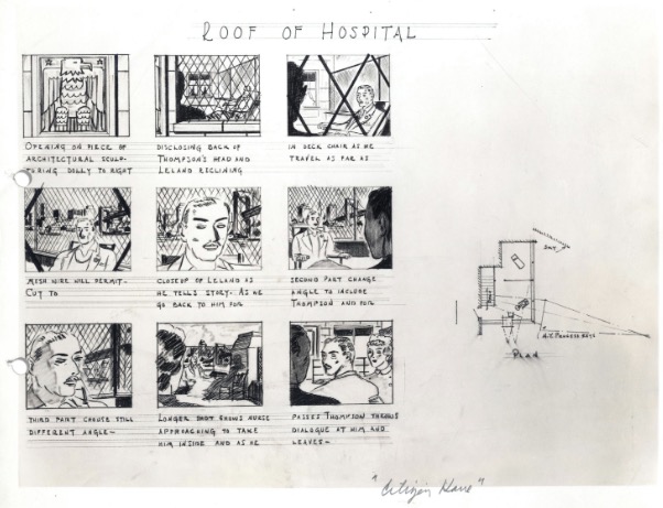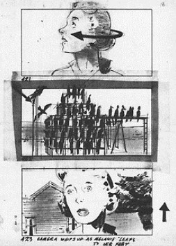 Ejemplos de Storyboards cinematográficos. The Birds (1963) de Alfred Hitchcock y Citicen Kane (1941) Orson Welles. Ambos con indicaciones relacionadas con los movimientos de los actores y las posiciones de cámara.