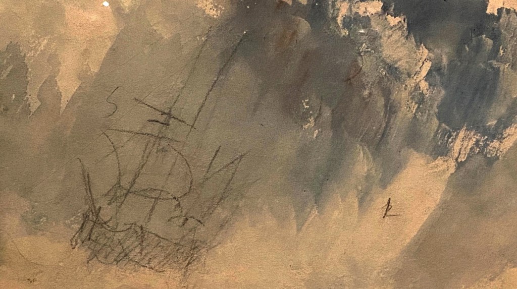 Boceto preparatorio. Obra de William Turner Turner, 1775-1851. (La luz es color. Museu Nacional d’Art de Catalunya, 20 de Maig, 11 de Setembre de 2022) Podemos apreciar las anotaciones numéricas, relacionadas con el proceso de ejecución de la obra.